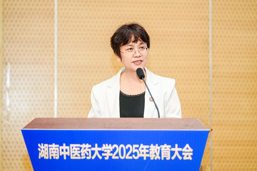 副校长喻嵘作大会工作报告。她回顾了2019年以来在教育教学上取得的十个方面显著成就,分析了高等教育面临的新形势、新要求与新挑战,重点部署了包括“立德铸魂·时代新人”领航、“学科专业·内涵升级”培优、“课程重构·教学创新”攻坚等“八大行动计划”,全面推进教育教学改革向深而行,培养担当民族复兴和中医药振兴大任的时代新人。